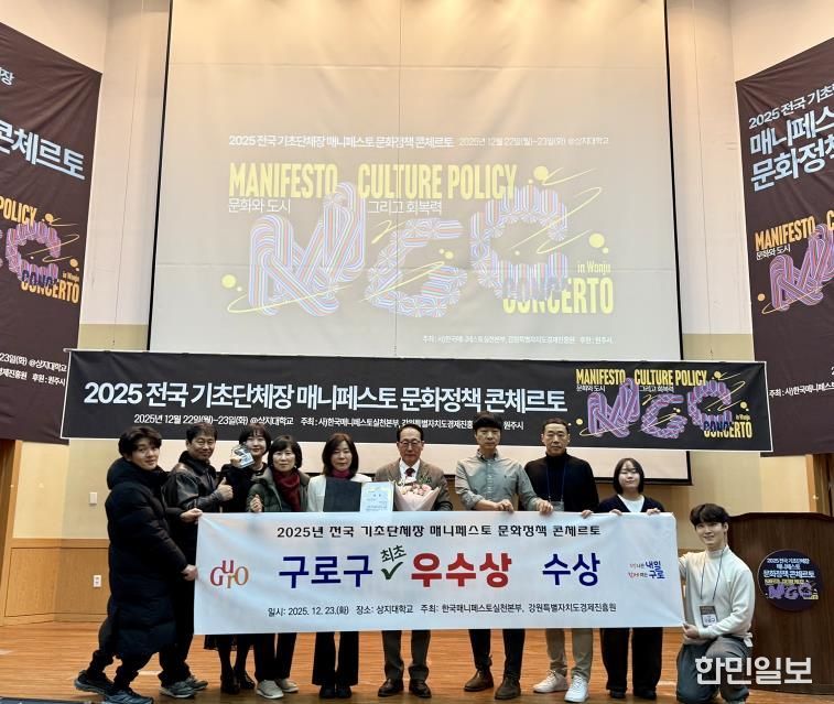 한민일보 서울포커스 진광성 기자 | 구로구가 12월 23일 원주시 상지대학교에서 열린 ‘2025 전국 기초단체장 매니페스토 문화정책 콘체르토’ 본선 대회에서 ‘문화열차 959’ 사례로 문화기반도시활력 분야 우수상을 수상했다. 이번 수상은 도시 활력 회복을 위한 구의 문화정책 성과를 인정받은 결과다.