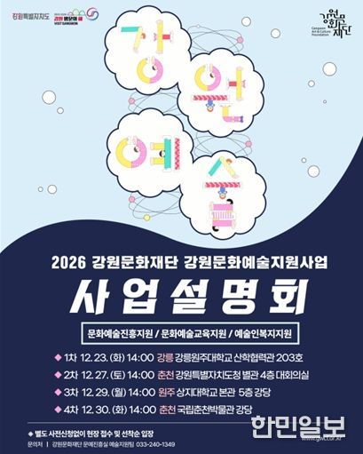 한민일보 서울포커스 곽중희 기자 | 강원문화재단은 2026년 강원문화예술지원사업의 주요 내용과 변경 사항을 도내 예술인에게 종합적으로 안내하기 위해 ‘2026년 강원문화예술지원사업 통합 설명회’를 개최한다고 밝혔다.
