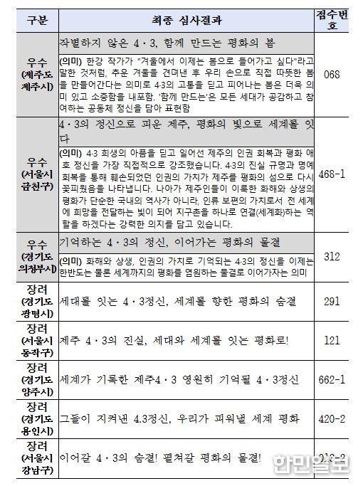 장려작으로는 ‘세대를 잇는 4·3정신, 세계를 향한 평화의 숨결’, ‘제주4·3의 진실, 세대와 세계를 잇는 평화로!’, ‘세계가 기록한 제주4·3 영원히 기억될 4·3정신’, ‘그들이 지켜낸 4·3정신, 우리가 피워낼 세계 평화’, ‘이어갈 4·3의 숨결! 펼쳐갈 평화의 물결!’ 등 5편이 선정됐다.