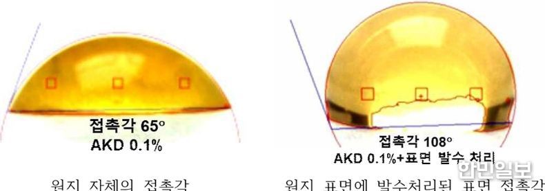 연구진에 따르면, 실제로 내첨 AKD 0.1%만 적용했을 때 접촉각이 약 65° 수준인 반면, 동일 조건에서 표면 발수 처리를 병행하면 접촉각이 약 108°까지 비약적으로 증가하여, 내첨 AKD 사용량을 최대 70%까지 절감할 수 있음을 확인했다.