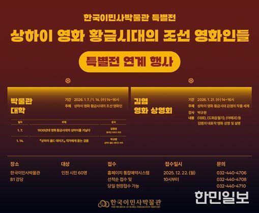 한민일보 서울포커스 유창렬 기자 | 인천광역시 시립박물관 분관 한국이민사박물관은 특별전 〈상하이 영화 황금시대의 조선 영화인들〉과 연계해 중국 영화 황제로 불렸던 배우 김염(金焰)의 대표 영화 작품 상영회를 개최한다.