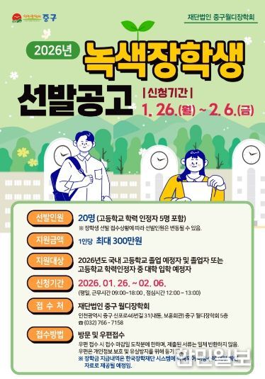 한민일보 서울포커스 김다남 기자 | 재단법인 인천 중구월디장학회(이사장 김정헌)는 지역 인재 육성을 위해 ‘2026년도 녹색 장학생’ 대상자를 모집한다고 20일 밝혔다.