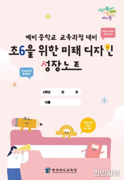 한민일보 서울포커스 임경복 기자 | 충청북도교육청은 초등학교 6학년 학생들의 중학교 진학 준비와 진로 설계를 돕기 위해〈예비 중학교 교육과정 대비 초6을 위한 미래 디자인 성장노트'를 제작해 도내 모든 초등학교에 책자로 보급했다고 밝혔다.