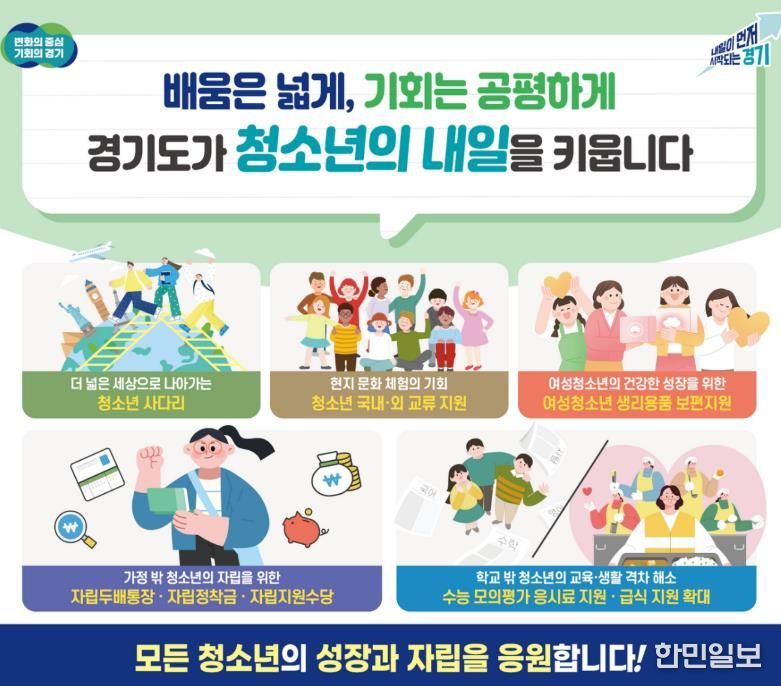 한민일보 서울포커스 김윤이 기자 | 경기도가 청소년의 건강한 성장과 배움 기회, 생활 안정을 위해 급식, 학습·진로·자립 지원까지 아우르는 다양한 정책을 추진한다.