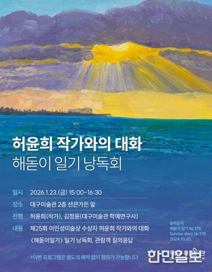 한민일보 서울포커스 김봉순 기자 | 대구문화예술진흥원 대구미술관은 제25회 이인성미술상 수상자전 ‘허윤희: 가득찬 빔’의 전시 연계 프로그램으로 ‘허윤희 작가와의 대화: 해돋이 일기 낭독회’를 1월 23일 오후 3시, 대구미술관 2층 선큰가든에서 개최한다.