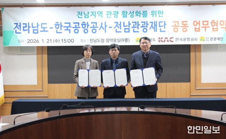 한민일보 서울포커스 박정민 기자 | 전라남도는 21일 한국공항공사, 전남관광재단과 함께 무안국제공항과 연계한 여행업계 지원 및 전남 관광 활성화 업무협약을 했다.