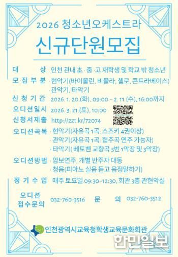 한민일보 서울포커스 유창렬 기자 | 인천광역시교육청학생교육문화회관은 3월 21일 ‘2026학년도 청소년오케스트라 단원 모집 오디션’을 실시한다.