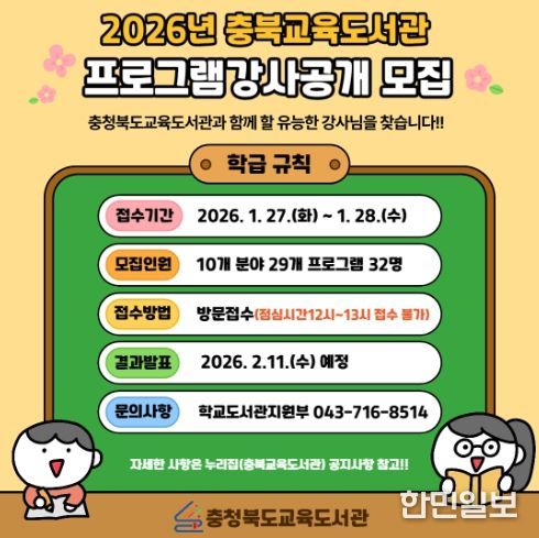 한민일보 서울포커스 임경복 기자 | 충청북도교육청 직속기관 교육도서관(관장 노재경)은 학생과 학부모, 지역주민에게 다양한 배움의 기회를 제공하기 위해 27일부터 28일까지 교육프로그램 강사를 공개 모집한다.