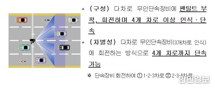 한민일보 서울포커스 최성훈 기자 | 경찰청은 최근 급증하고 있는 무인교통단속장비를 효율적으로 관리하기 위하여 편도 3차로 이상을 단속할 수 있는 ‘다차로·회전식 단속장비’를 도입하는 등 운영 효율화 방안을 추진한다.