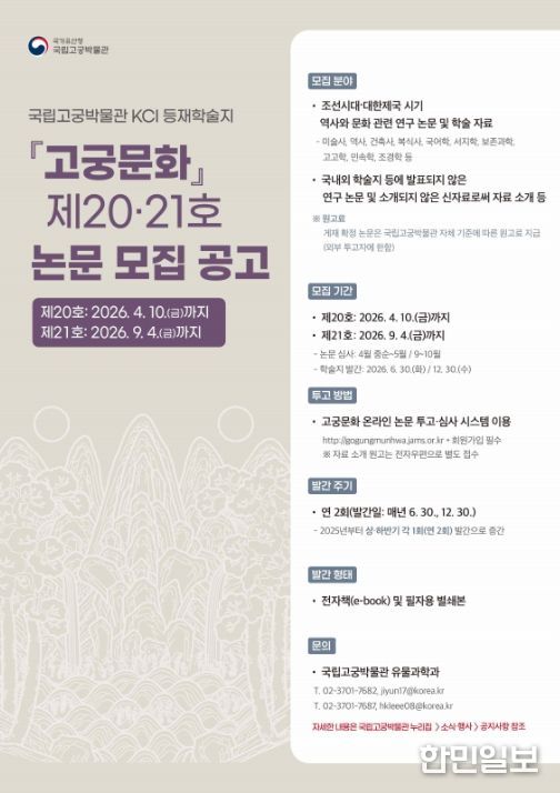 한민일보 서울포커스 박용남 기자 | 국가유산청 국립고궁박물관은 조선시대와 대한제국기의 역사·문화 연구를 활성화하기 위해 박물관에서 매년 발간하는 학술지 『고궁문화』 제20호와 제21호에 수록할 논문을 모집한다. 제20호는 올해 6월 30일, 제21호는 12월 30일 발간 예정이며, 논문 접수 마감일은 각각 4월 10일과 9월 4일이다.