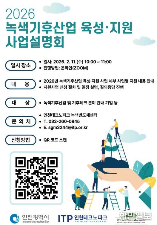 한민일보 서울포커스 유창렬 기자 | 인천테크노파크는 오는 2월 11일 오전 10시에 인천 지역 녹색기후산업 및 기후테크 분야 기업을 대상으로 ‘2026년 녹색기후산업 육성·지원’ 사업설명회를 온라인으로 개최한다고 밝혔다.