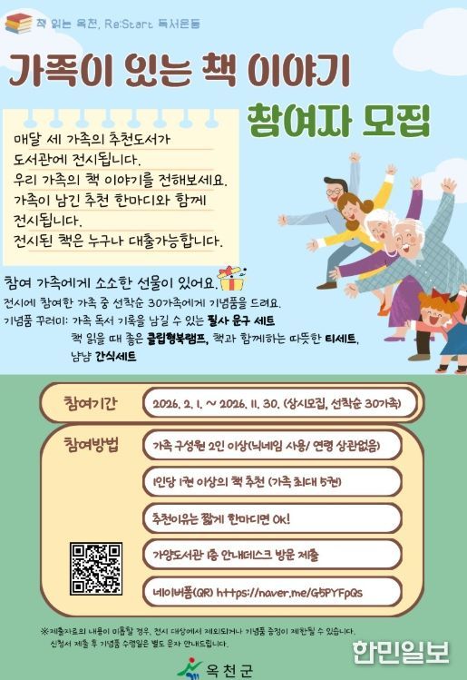 한민일보 서울포커스 김다남 기자 | 옥천군은 가족 간 소통과 독서 문화 확산을 위해 ‘책 읽는 옥천, Re:Start 독서운동’의 일환으로 가족 참여형 추천도서 릴레이 프로그램 '가족이 잇는 책 이야기'를 가양도서관에서 운영한다고 밝혔다.