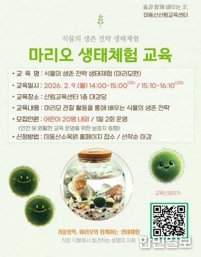 한민일보 서울포커스 임경복 기자 | 충청북도산림환경연구소는 겨울방학을 맞은 어린이를 대상으로 오는 2월 9일 미동산수목원 내 산림교육센터에서 '식물의 생존 전략 생태체험(마리모 편)'을 운영한다.