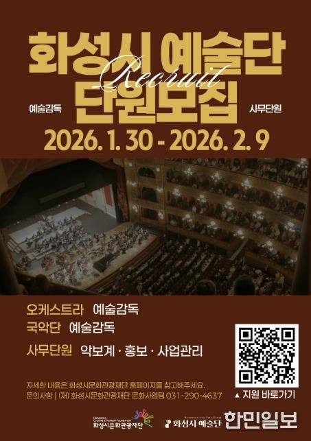한민일보 서울포커스 진광성 기자 | (재)화성시문화관광재단은 2026년 ‘화성시 예술단’을 이끌어갈 예술감독과 사무단원을 모집한다.