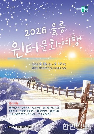 울릉군은 현재 선박 할인 혜택을 제공하는 ‘울릉 윈터패스’가 1~2월 두 달간 운영되고 있는 가운데, 겨울철 지역 문화 콘텐츠 확산과 관광 활성화를 위해 '2026년 울릉 윈터문화여행'을 오는 2월 15일부터 17일까지 3일간, 울릉한마음회관과 나리분지 일원에서 펼쳐진다.
