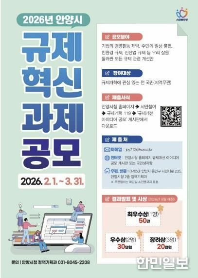 한민일보 서울포커스 김성윤 기자 | 안양시는 시민이 직접 체감하는 규제혁신을 실현하고 다양한 규제개선 아이디어 발굴을 위해 오는 3월 31일까지‘2026년 안양시 규제혁신 과제 공모’를 진행한다고 2일 밝혔다.