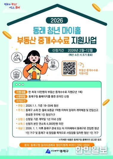 한민일보 서울포커스 임광현 기자 | 부산 동래구는 청년의 주거 안정을 지원하고 청년 창업을 유도하기 위해 ‘2026년 동래 청년 마이홈 부동산 중개수수료 지원 사업’을 추진한다고 밝혔다. 접수 기간은 12월 10일까지이며, 예산 소진 시 조기 마감된다.