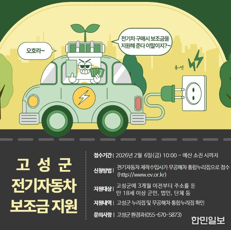 한민일보 서울포커스 김은금 기자 | 고성군은 대기질을 개선하고 미세먼지 및 기후·생태계 변화 유발물질을 줄이기 위해 2026년 전기자동차 보급사업을 추진한다고 밝혔다.
