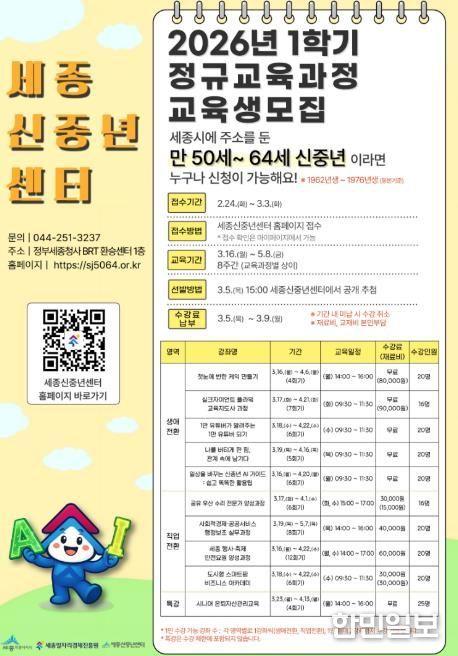 한민일보 서울포커스 김윤이 기자 | 세종일자리경제진흥원이 운영하는 ‘세종시 신중년 AI 디지털 일자리센터’가 오는 2월 24일부터 ‘2026년 1학기 정규과정’ 교육생을 모집한다.
