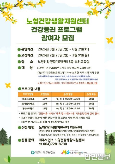 한민일보 서울포커스 김다남 기자 | 제주보건소 노형건강생활지원센터는 2월 23일부터 3월 9일까지 지역주민의 건강위험요인 개선을 위한 건강증진 프로그램 참여자를 모집한다.