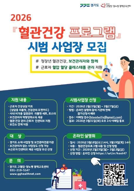 한민일보 서울포커스 김윤이 기자 | 경기도가 올해 650개 사업장 근로자를 대상으로 ‘혈관건강 프로그램’을 운영한다며 3월 27일까지 사업장을 모집한다.