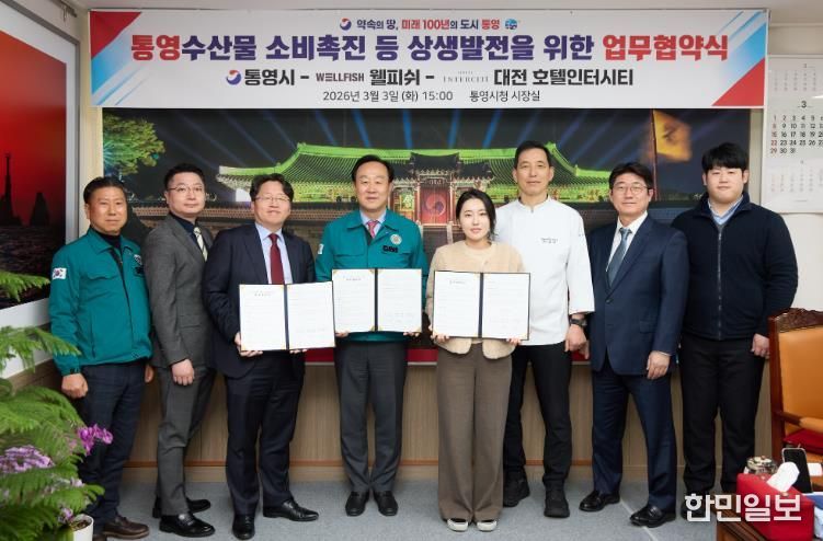 한민일보 서울포커스 김서윤 기자 | 통영시는 지난 3일 시청에서 웰피쉬(주)(대표 정여울), 대전 호텔인터시티(대표 이병학)와 함께 통영 수산물 소비촉진과 상생발전을 위한 3자 업무협약(MOU)을 체결했다.