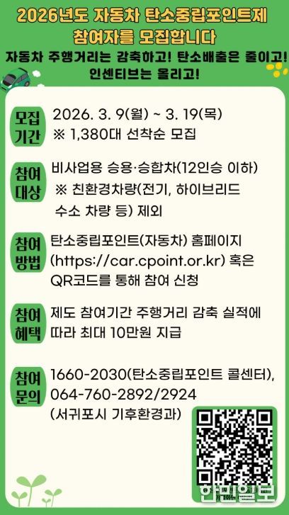한민일보 서울포커스 김다남 기자 | 서귀포시는 3월 9일부터 3월 19일까지 수송부문 온실가스 감축 프로그램인 자동차 탄소중립포인트제 참여자 1,380명을 선착순 모집한다고 밝혔다.