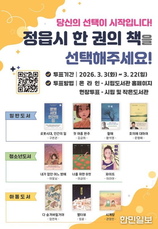 한민일보 서울포커스 김용택 기자 | 정읍시가 시민이 함께 읽고 공감하는 독서문화 확산을 위해 2026년 ‘한 권의 책’ 선정을 위한 시민 투표를 오는 22일까지 온·오프라인으로 실시한다.