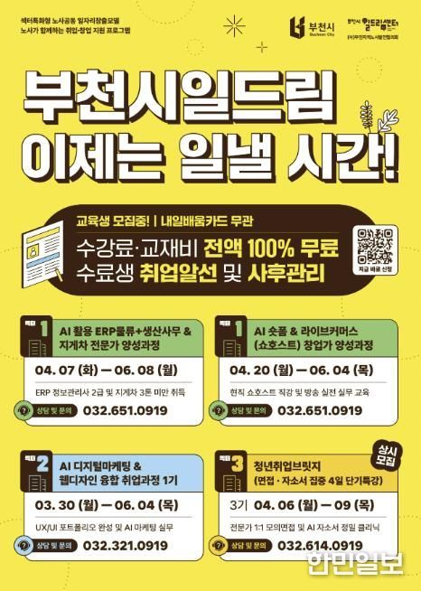 한민일보 서울포커스 김윤이 기자 | 부천시는 부천시일드림센터와 함께 2026년 상반기 취·창업 교육생을 모집한다. 이번 교육은 내일배움카드 발급 여부와 관계없이 수강료와 교재비를 전액 무료로 지원해 구직자의 교육 참여 부담을 낮췄다.