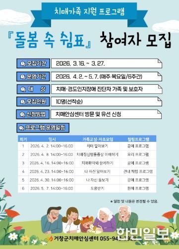 한민일보 서울포커스 김서윤 기자 | 거창군 치매안심센터는 치매 환자를 돌보는 가족과 보호자들의 부담을 덜고 돌봄 역량 강화를 위한 지원 프로그램 『돌봄 속 쉼표』에 참여할 대상자를 이달 16일부터 27일까지 모집한다.