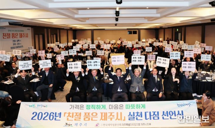 한민일보 서울포커스 김다남 기자 | 제주시는 11일 메종글래드 제주에서 열린 한국외식업중앙회 제주특별자치도지회 제주시지부 정기총회에서 ‘친절 품은 제주시: 정직한 가격, 따뜻한 마음’ 실천 다짐 선언식을 개최했다.