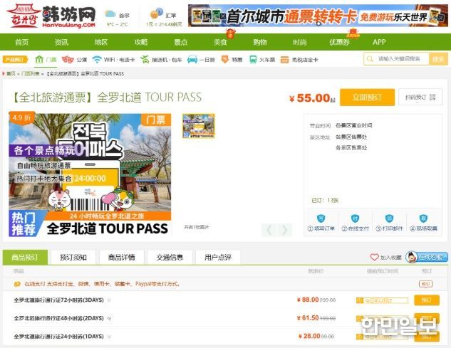 한민일보 서울포커스 임경복 기자 | 전북특별자치도는 도내 대표 관광상품인 ‘전북투어패스’를 중국 최대 한국 여행 정보 플랫폼인 ‘한유망(韩游网)’에 입점시키고 이달부터 본격적인 판매에 돌입했다고 12일 밝혔다.