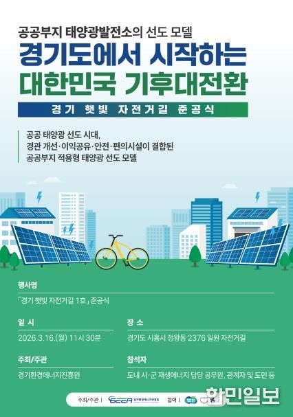 한민일보 서울포커스 김윤이 기자 | 경기환경에너지진흥원은 16일 시흥시 정왕동 2376일원 자전거길에서 ‘경기 햇빛 자전거길 1호’ 준공식을 개최한다고 13일 밝혔다.