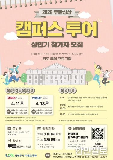 한민일보 서울포커스 김성윤 기자 | 남양주시는 오는 4월 11일과 18일 양일간 관내 초등학교 4학년부터 고등학생을 대상으로 ‘무한상상 캠퍼스 투어’ 프로그램을 운영한다고 16일 밝혔다.
