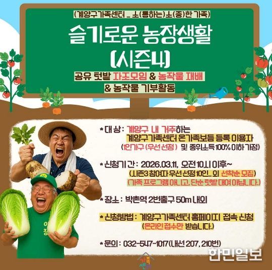 한민일보 서울포커스 김성혜 기자 | 인천 계양구가족센터(센터장 권도국)는 지역 내 1인가구 및 취약가구를 대상으로 3월 28일부터 공유 텃밭 프로그램 ‘슬기로운 농장생활 시즌4’를 진행할 예정이다.