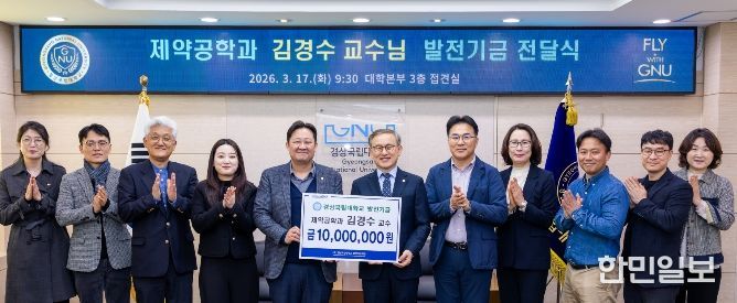 한민일보 서울포커스 박근원 기자 | 경상국립대학교는 3월 17일 오전 9시 30분 대학본부 3층 접견실에서 김경수 국제협력부처장(제약공학과 교수)의 대학발전기금 전달식을 개최했다.