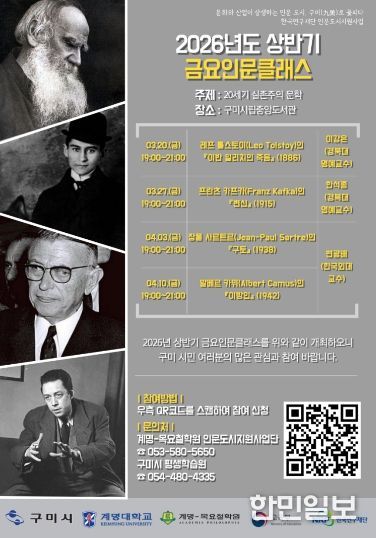 한민일보 서울포커스 김봉순 기자 | 구미시와 계명대학교가 공동 추진하는 인문도시 지원사업의 일환인 ‘금요인문클래스’가 2026년 상반기 강좌를 시작한다. 이 프로그램은 2022년부터 기획·운영되어 온 시민 대상 공개 강좌로, 구미시민이라면 누구나 참여할 수 있으며 현재 구미를 대표하는 인문교양 프로그램으로 자리매김하고 있다.