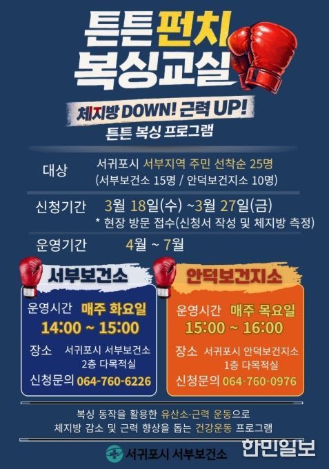 한민일보 서울포커스 김다남 기자 | 서귀포시 서부보건소는 지역주민의 비만율을 개선하고 건강한 신체활동 습관을 형성하기 위해 중강도 신체활동 프로그램인 ‘튼튼 펀치 복싱교실’ 참여자를 3월 18일부터 27일까지 모집한다.
