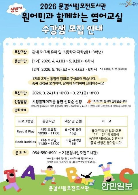 한민일보 서울포커스 김봉순 기자 | 문경시립모전도서관은 오는 4월 4일부터 7월 4일까지 매주 토요일, 상반기 ‘원어민과 함께하는 영어교실’ 프로그램을 운영한다.
