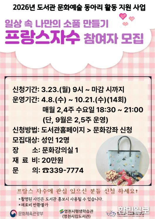 한민일보 서울포커스 김봉순 기자 | 영천시 평생학습관은 지역 주민을 대상으로 ‘프랑스 자수’ 문화예술 동아리를 운영한다고 밝혔다.