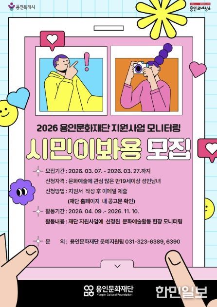 한민일보 서울포커스 김성윤 기자 | 용인문화재단은 오는 27일까지 용인예술창작지원 선정사업을 시민의 시선에 경험하고 평가하는 “2026 용인문화재단 지원사업 모니터링 '시민이봐용'” 참여자를 모집한다.