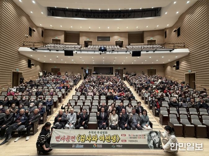 한민일보 서울포커스 김서윤 기자 | 거창군은 지난 20일, 거창문화센터 공연장에서 거창군 삶의 쉼터 주관으로 어르신 400여 명을 모시고 개최한 무성영화 변사극 ‘검사와 여선생’ 공연이 성황리에 마무리됐다고 밝혔다.