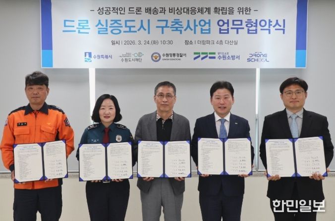 한민일보 서울포커스 진광성 기자 | 수원특례시, 수원도시재단, 수원영통경찰서, 수원소방서, ㈜드론스쿨인터네셔널은 24일 더함파크에서 ‘드론 실증도시 구축 사업’ 추진을 위한 업무협약을 체결하고, 협력을 약속했다.