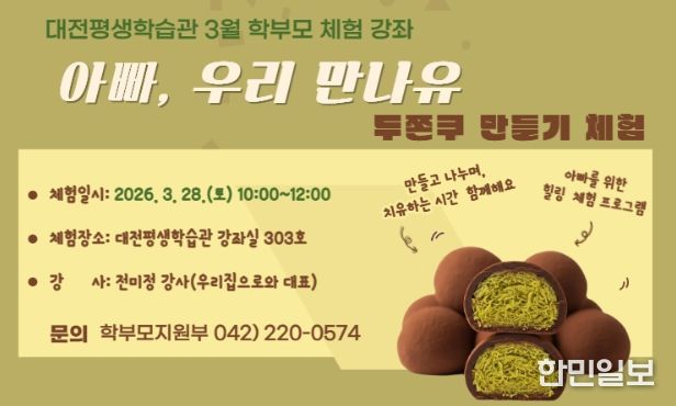 한민일보 서울포커스 유한희 기자 | 대전시교육청 평생학습관은 아버지 학부모의 적극적인 참여와 역할 강화를 위한 마중물로 힐링 체험 프로그램인 ‘두바이쫀득쿠키만들기’ 요리 강좌를 3월 28일 오전에 운영한다고 밝혔다.