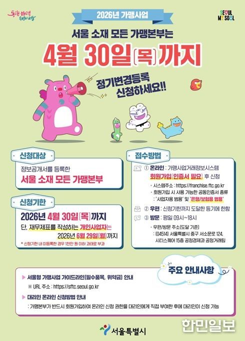 한민일보 서울포커스 국용호 기자 | 서울시는 서울시에 등록된 모든 프랜차이즈 가맹본부는 4월 30일까지 2025년 사업내용을 반영한 ‘가맹사업 정보공개서 정기 변경등록’ 신청을 완료해야 한다고 밝혔다. 아울러 시는 가맹본부의 변경등록 지원을 위해 3월 26일 온라인 설명회를 개최할 예정이다.