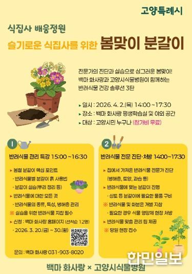식집사 배움정원은 고양시민이라면 누구나 참여할 수 있다. 반려식물 관리 특강은 오는 3월 30일까지, 실내식물관리사 자격 취득 과정은 오는 3월 31일부터 4월 14일까지 백마 화사랑 누리집을 통해 선착순으로 접수한다. 또 반려식물 진단·처방 프로그램은 당일(4월 2일) 현장에서 신청이 가능하다.