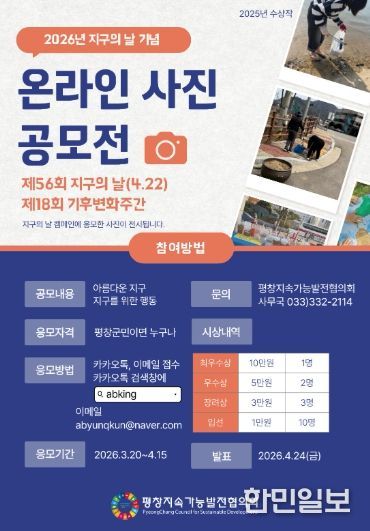접수 기간은 4월 15일까지이며, 응모 방법은 사진 파일을 이메일이나 카카오톡 메시지로 제출하면 된다. 응모작은 1차 심사를 거쳐 4월 22일 ‘평창에코랜드’에서 열리는 지구의 날 캠페인 행사장 내 전시될 예정이며, 우수작에는 소정의 상금이 지급된다.
