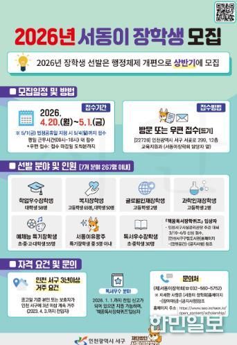 한민일보 서울포커스 김용택 기자 | 인천 서구 재단법인 서동이장학회는 지역 인재 양성을 위한 ‘2026년도 서동이 장학생’을 상반기에 모집한다.