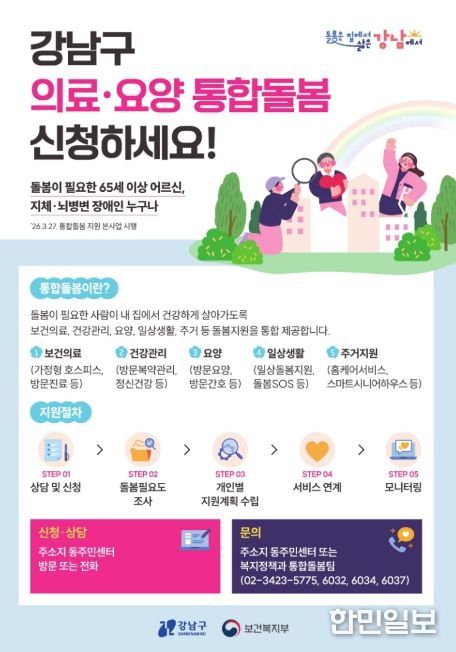 한민일보 서울포커스 박정민 기자 | 꿈이 모이는 도시, 미래를 그리는 강남구가 3월 27일부터 어르신과 장애인 등이 살던 곳에서 의료·요양·돌봄 서비스를 통합 지원받는 ‘강남형 통합돌봄’ 본사업을 시작한다.