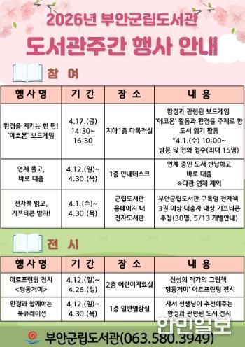 한민일보 서울포커스 김용택 기자 | 부안군립도서관은 2026년 도서관의 날(4월 12일)과 도서관주간(4월 12~18일)을 맞아 지역 주민들을 위한 다채로운 독서 문화 행사를 운영한다고 밝혔다.